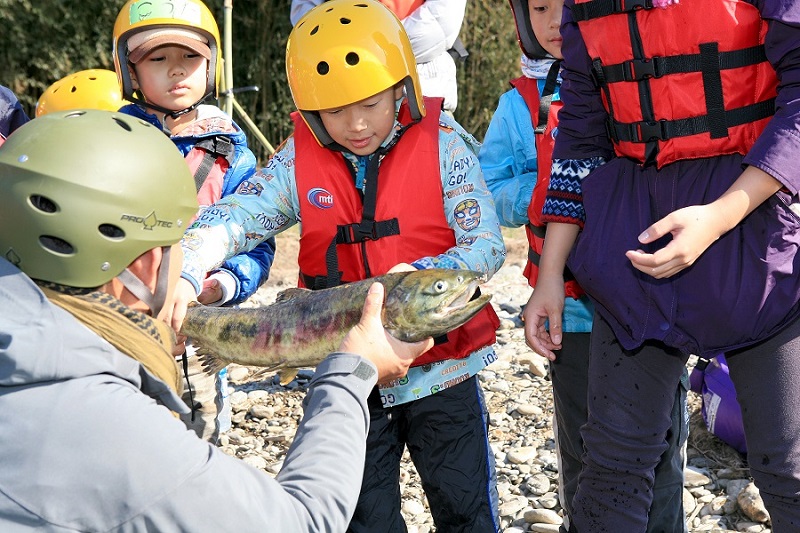 秋の感謝祭にて、ダイナミックなサケ遡上を眺めながらの川下りツアーを開催。
